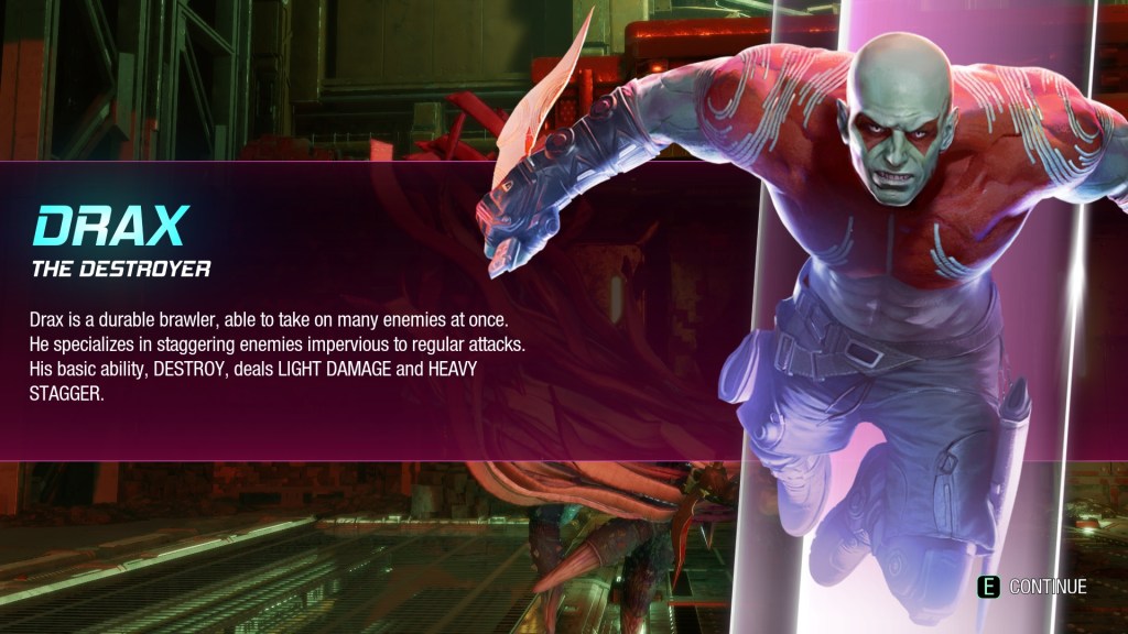 In addition to the weapons and abilities available to Starlord each of the Guardians have their own set of abilities to unlock and upgrade. Rocket is an explosives expert and has access to a multitude of grenades for a wide area of damage, Groot can entangle enemies, locking them in place for a time, Gamora has a range of high damage abilities with her sword, and Drax’s abilities focus on building up an enemy’s stun gauge which stuns and increases the damage an enemy receives in addition to sometimes allowing a special follow up attack which can remove an ability such as a tail attack or flying.