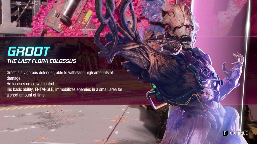 Groot is Groot, a sentient tree-like being known as a Flora Colossus and an exile from his home planet, the now destroyed Planet X. He speaks a language only Rocket can understand and throughout the game collects (or smuggles) various plant species from the different planets the Guardians explore to his own little corner of their spaceship.