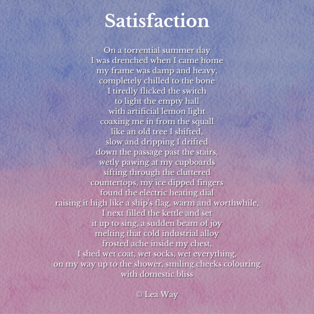 ~Satisfaction from Lea Way tells a simple story after an eventful day. I liked the skillful references between dampness and warmth used throughout. By the end, the poem captures the feeling of being somewhere familiar, somewhere there is a sense of belonging: Home.